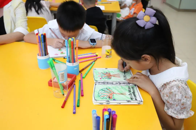 孩子们用彩色画笔,小手拉大手,共同参与“我为广东种棵树”实践,以迷你书的形式描绘出心中的“绿美广东”。