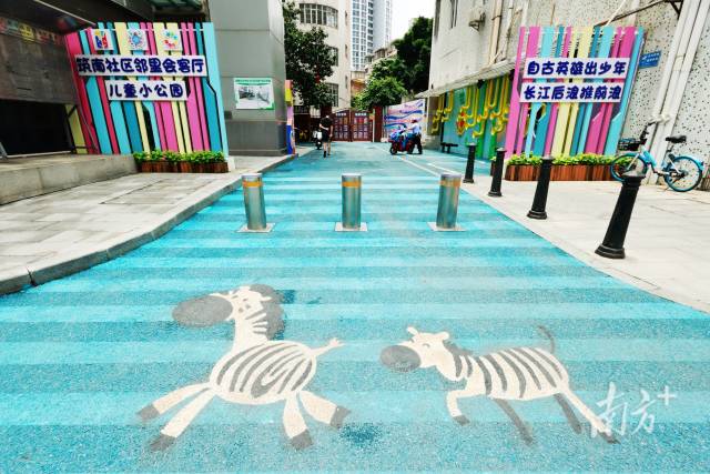 广州市白云街筑南社区入口为儿童设置了可爱的“斑马线”。