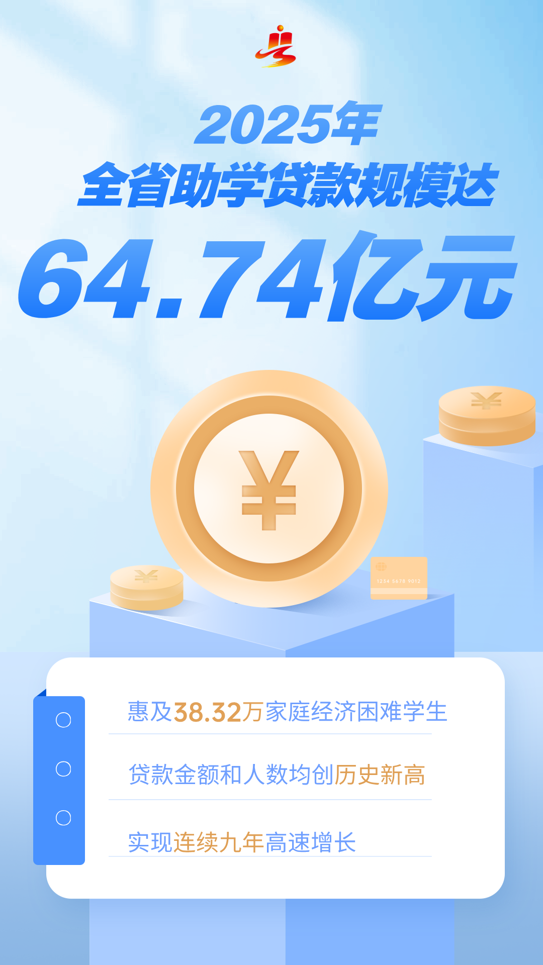 一方面,连续三年提高生源地信用助学贷款额度,确保学生“只要考得上,都能读得起”。2025年全省助学贷款规模达64.74亿元,惠及38.32万家庭经济困难学生,贷款金额和人数均创历史新高,实现连续九年高速增长。