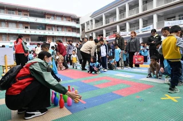 岭南项目体验区则让传统文化与体育竞技碰撞出别样火花。亲子投壶、传统射箭、扔沙包、踢毽子等项目,不仅考验着孩子们的动手能力与协调性,更让家长们重温童年记忆,实现体育文化的代际传递;新型项目拓展区中,软式飞盘、趣味保龄球、蹦床跳跃、跑酷挑战等现代运动项目,为乡村幼儿带来新鲜体验,专业指导员的全程守护,让孩子们在安全前提下感受运动的刺激与快乐。